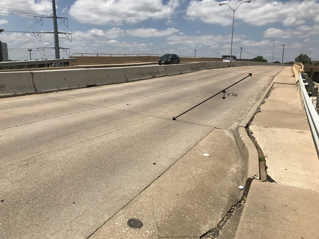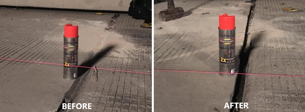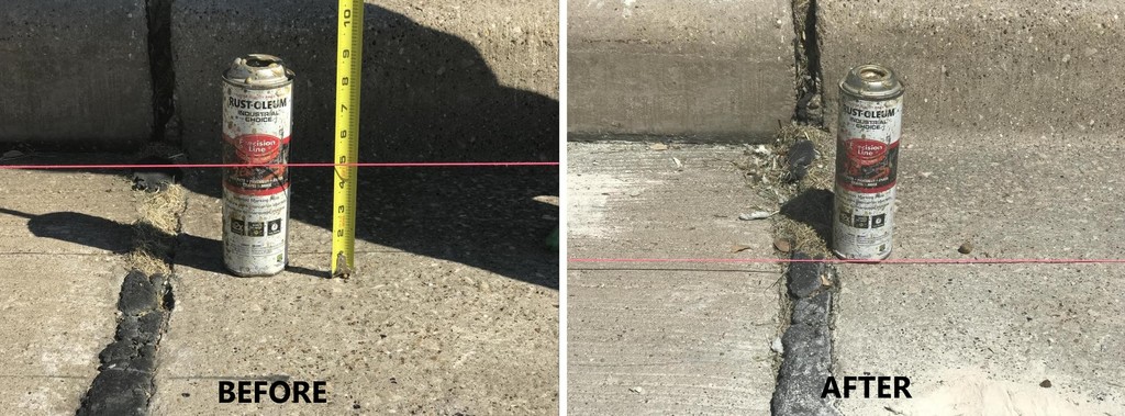 When bridges are built, the heavy equipment used for compacting foundation soils are not always capable of compacting soils close to the bridge abutment wall. Over time, the unstable soils settle, creating a dip at the approach and/or departure slab of the bridge. This is exactly what happened at the jobsite pictured below. Here, the approach slab had settled 5 inches. By injecting high-density polyurethane foam below the concrete and into the foundation soils, the approach slab was lifted back to its initial elevation, and the soils beneath were compacted to eliminate future settlement. The project was completed in one day, and at least one lane was open for traffic at all times.