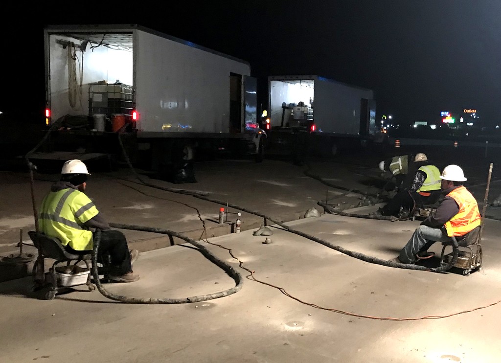 Faulting along the transverse joint (or expansion joint), is a very common problem among arterial city streets and state highways. This faulting causes a washboard effect, and can be felt and heard when driven over. Our high-density polyurethane foam injection process, combined with with grinding at the expansion joints, has proven to greatly improve the ride quality, and prevent future faulting. As the foam is injected, it first fills any voids created by water intrusion and/or settlement of sub-grade soils over time. The foam then begins to compact these soils, followed by vertical lift until the joint correctly realigns. Any joints that are not able to be matched perfectly will be ground down to provide a smooth ride. The compressive strength and hydrophobic nature of the foam allows for a long-lasting solution. Many cities and transportation departments have chosen this process because it works. Road deflection tests have proven that it greatly increases the ride quality index. Our crews are capable of fixing up to one half lane miles per day, preventing long periods of unwanted down-time and disruption.